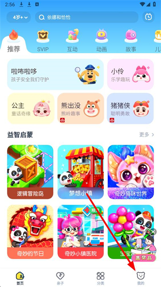 1、在宝宝巴士儿歌app,找到界面底部我的选项并点击,进入对应页面。