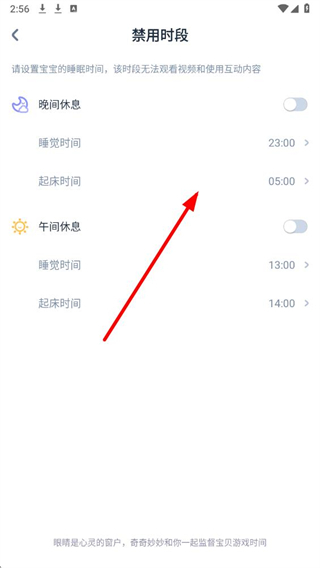 4、在禁用时段页面,开启晚间休息或午间休息开关,可设置对应时段的睡觉与起床时间,限制使用。
