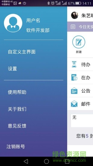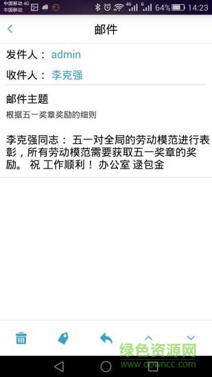 通过手机可以新建并发送邮件给办公系统中的用户,也可以查看收件箱中的邮件,并进行答复和转发等操作。