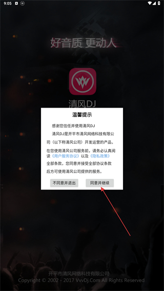 1、启动清风dj的应用软件,进入时会弹出温馨提示,点击同意并继续的按钮。