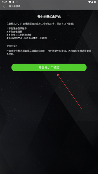 4、进入青少年模式的页面内,仔细阅读后再点击开启青少年模式即可。