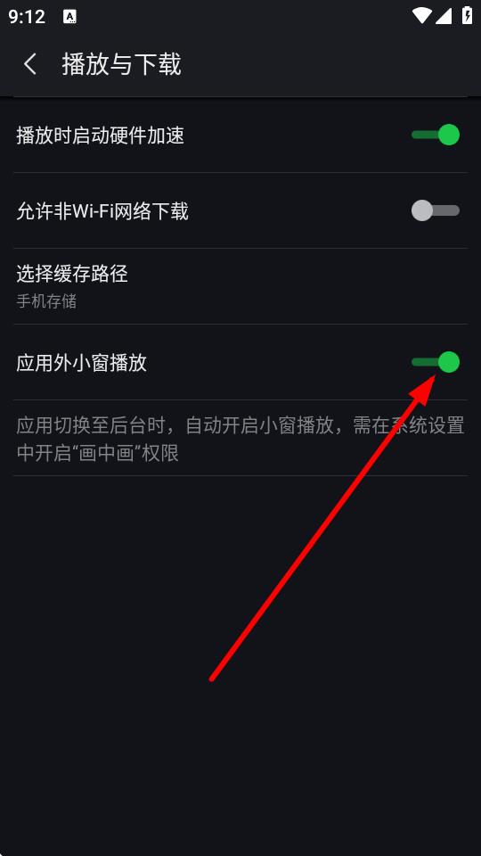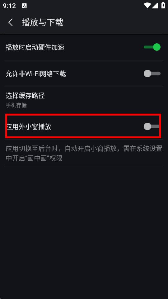 4、点击应用外小窗播放右侧开关将其打开,同时确保系统设置中已开启画中画权限,就能使用小窗播放功能了。