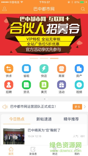 巴中都市网app是专门为生活在巴中的用户打造的智能生活软件,超多便利的生活服务让每一位用户的生活能够享受到更多的便利,无论是生活购物还是招聘求职等等全部都有,让巴中随着时代的改变而改变,需要的用户快来绿色资源网下载吧!