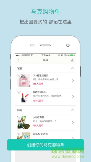 马克购物清单安卓版是一款境外旅行购物清单软件,使用app用户可以在线记录需要购买的产品,可直接查看各地商品价格及品牌,支持清单分类功能,需要的朋友欢迎来绿色资源网下载!