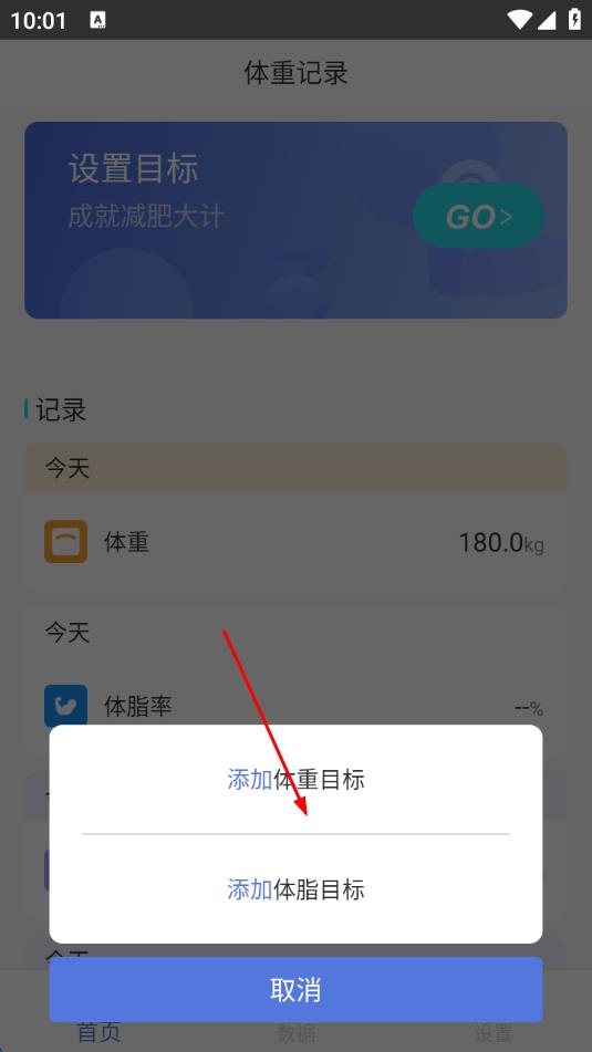2、在弹出的选项中,点击添加体重目标。
