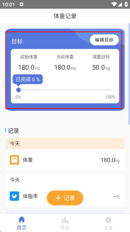 4、成功添加目标体重,之后在首页能查看目标体重相关的进度情况。