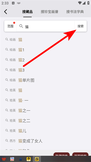 2、在搜索的页面,需要点击搜索按钮,进入搜藏品结果页面。