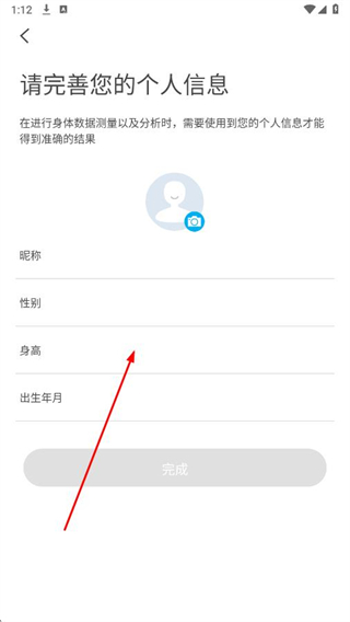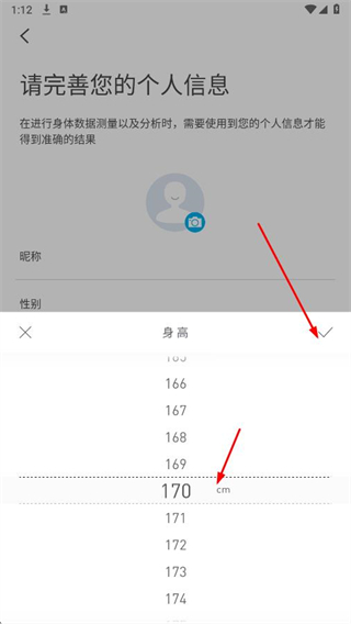 3、在完善个人信息页面,点击身高,进入身高选择界面。