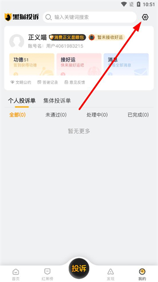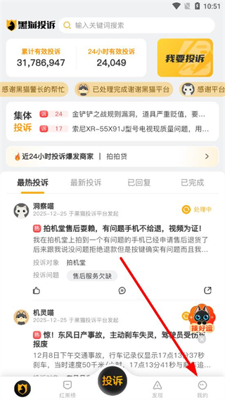 1、打开黑猫投诉APP,在首页点击右下角我的选项。