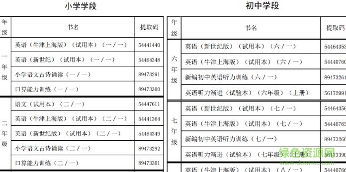 可从“上海中小学教材配套音频资料下载操作说明”后的提取码表中找到所购上海版教材配套音频的8位数字提取码,也可点击 【第一学期上海版教材配套音频资料提取码表】或【第二学期上海版教材配套音频资料提取码表】 ,在线查阅8位数字提取码。