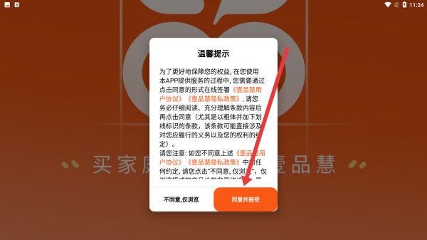 1、点击温馨提示弹窗的同意并接受,签署协议,进入壹品慧APP主界面。