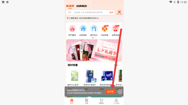2、进入壹品慧首页,可以点击底部的去开启按钮,开启手机的定位服务。