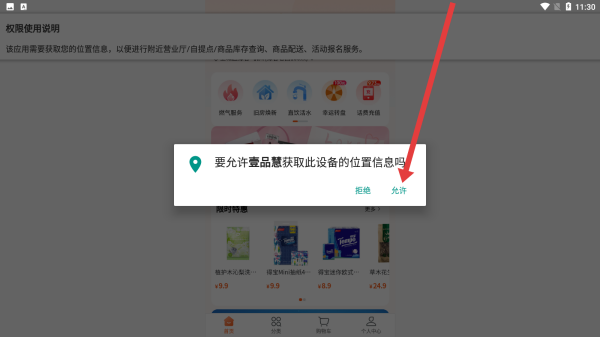 3、在位置权限弹窗点击允许按钮,授权获取手机设备位置,开启支持配送等服务使用。