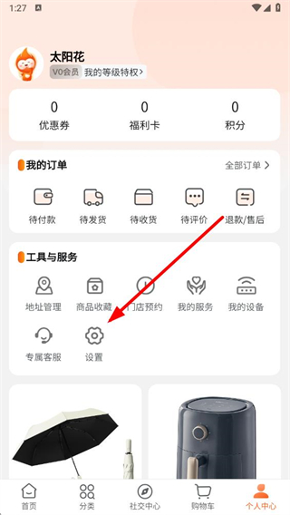 2、进入个人中心界面后,在工具与服务区域找到设置选项并点击,进入设置页面。
