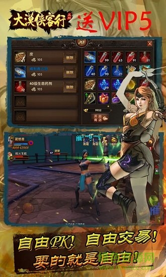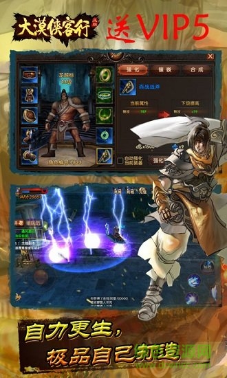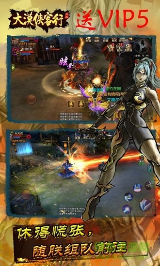 大漠侠客行变态版隋朝末期,天下大乱,妖魔四起,天庭为救庶民于水火,派遣各路英雄进入神州腹地,铲妖伏魔,匡扶社稷。游戏采用开放结构,自由PK,即时换装,各种宠物、飞行坐骑,画面风格更接近与欧式写实,画面采用真实光照,乘具移动贴附地表等,展现身临其境的感受。玩法也是大开大合,既有剧情结合各种单人任务,也有多人组队玩法,还有大规模帮会战争,配合野外大地图、城镇、各种单人副本和组队副本,自由摆摊、交易,装备自己打、自己造,勾勒出一幅畅快淋漓的江湖画卷。