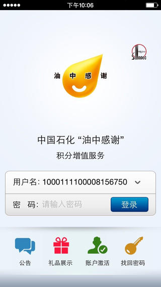 中国石化“油中感谢”积分增值服务推出手机客户端!登陆后,您可随时随地查询加油卡积分,在线兑换礼品,参与积分抽奖,查询礼品物流信息,注册免费道路救援,获取最新折扣、优惠信息,体验全新的“油中感谢”掌上移动服务!