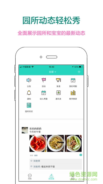 食谱、公告、活动、班级动态一键发布,家长们都能看见,还可以转发哦~