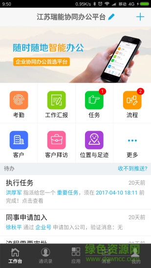 2.核心功能包括:待办提醒、通知、考勤、工作汇报、协作任务、流程审批、客户管理、客户拜访、拜访轨迹、人员位置等。