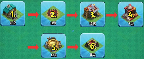防御类建筑按照重高轻三个级别来升级,优先升级地狱塔,十字连弩这类重防御,然后升级防空火箭、电塔、吹风机、法师塔、炸弹塔这些高防御建筑,最后升级加农炮、箭塔、迫击炮这三个熟悉的轻防御建筑,陷阱类的话能升级就尽量升到当前大本营的等级。