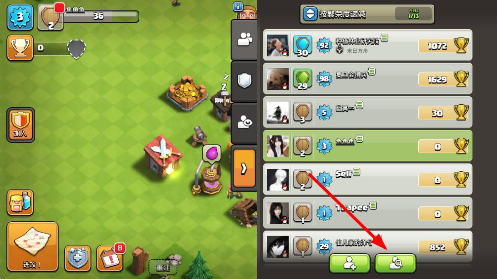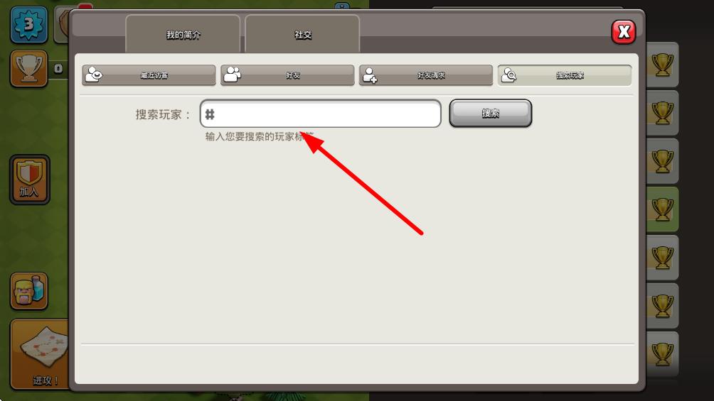 1、进入部落冲突游戏主界面,点击屏幕右侧带有手掌图标的社交按钮,进入社交相关操作界面。