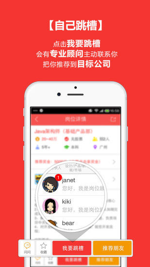 飞一般的跳槽体验,跳槽从未如此简单。跳槽大师,是一个为互联网中高层人士量身定制的移动端跳槽产品。跳槽大师为用户提供了最优质互联网公司的工作机会以及7×24小时高保密性的跳槽服务。跳槽大师,只为跳槽而生。