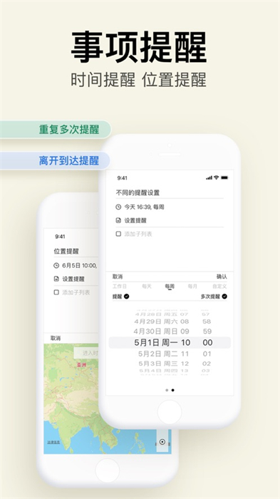 事项提醒:定时提醒,位置提醒。每天每两天...自定义重复周期。