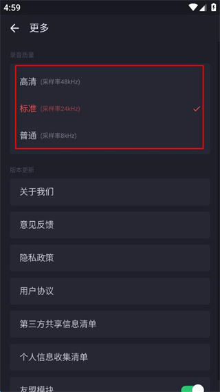 2、在更多页面选择录音质量,可选择高清、标准、普通其中一种。