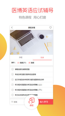 基于全国医学博士英语统考线下辅导班课程内容,共20讲,超过20个小时的视频课程。所有视频均由小白老师全部重新录制编辑,听力材料使用高清MP3,支持电脑和手机播放。