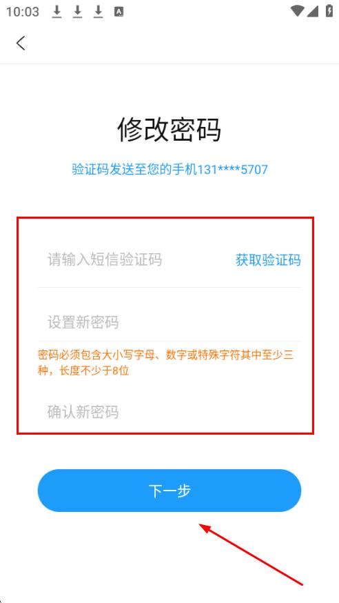 5、在修改密码页面,填入验证码,设置新密码 ,再次确认新密码,点击下一步。
