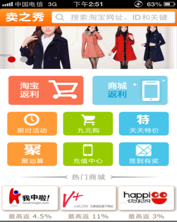 卖之秀掌上APP由银川超诚科技有限公司发布运营,它是集网络购物分享平台进行优化,综合淘宝商城所有类目,为网民提供在线导购、比价、返利、购物分享为一体的综合商城,也是最高的购物返现网,欢迎下载使用
