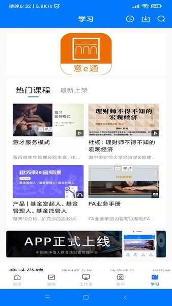 意e通app包含了非常多的理财课程与办公功能,是理财师的办公和学习平台,这里的理财课程非常的丰富,可以满足大家的多种需要,线上轻松的学习相关的理财课程,还有各种专业定制的办公工具满足使用需求,帮助广大理财师更好的提升自己,各种专业的课程都可以学习。