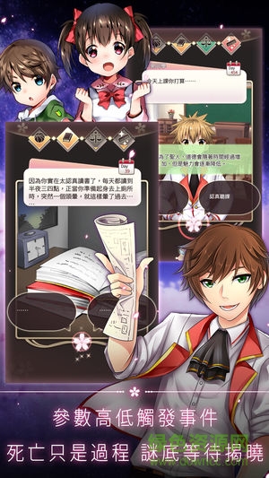 《落樱幻梦谭》同样以《落樱散华抄》的世界观为出发点,快来体验一场纯粹由对话进行的大冒险吧!在《落樱幻梦谭》中,玩家将面对樱华学园中的各种互动,并根据互动选项影响各项数值的升降。这些数值则会影响後续事件的互动及选项,甚至…影响着你的死亡。不死身的谜团、未知的诅咒,性情迥异的三名全新女主角,一切的一切,都在等待你的发现。