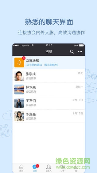 2、熟悉的聊天绿色资源网界面,连接协会内外人脉,高效沟通协作