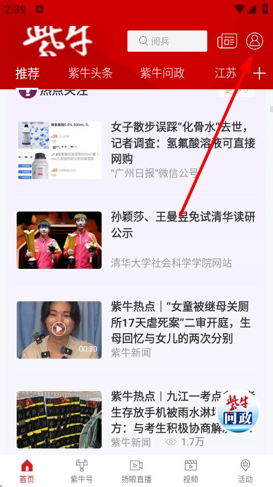 1、打开紫牛新闻App,点击首页右上角的头像图标进入个人页面。