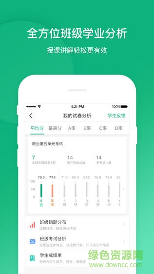 是提供给学校教师的移动在线的教学服务智能化分析APP,老师可在平台内布置企作业,每位学生的学习动态随时都可以了解,成绩报告,发布作业,接受发布通知等功能,深度解剖知识难点,随时在线查阅学生作业完成情况!
