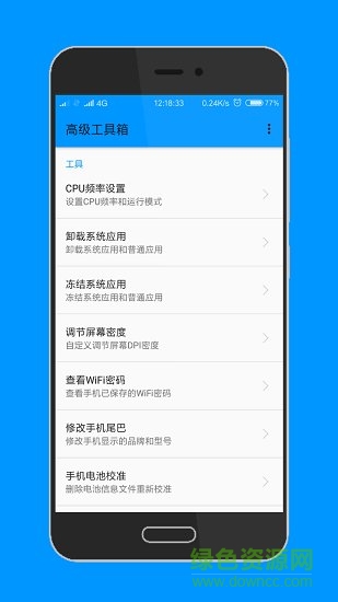 当前功能包括:CPU调频设置,卸载系统应用,冻结系统应用,调节屏幕DPI,查看WIFI密码,修改手机尾巴,手机电池校准!