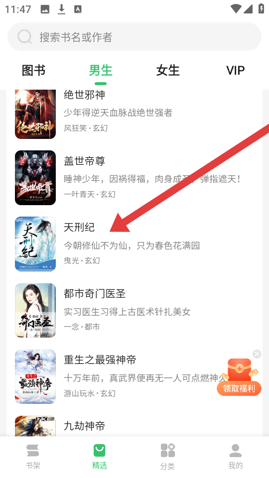 1、打开百度阅读APP的,我们可以选择进入精选的页面,来找到自己的目标小说并点击,进入书籍详情界面。