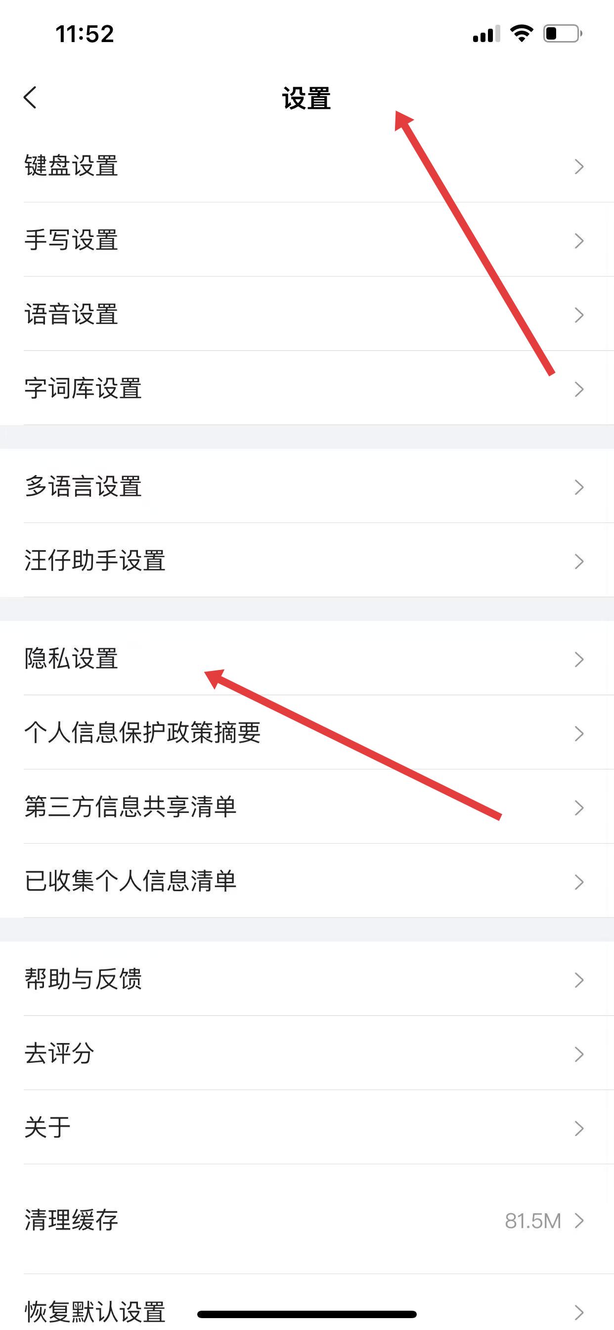 1、打开搜狗输入法,进入设置页面,点击隐私设置选项。