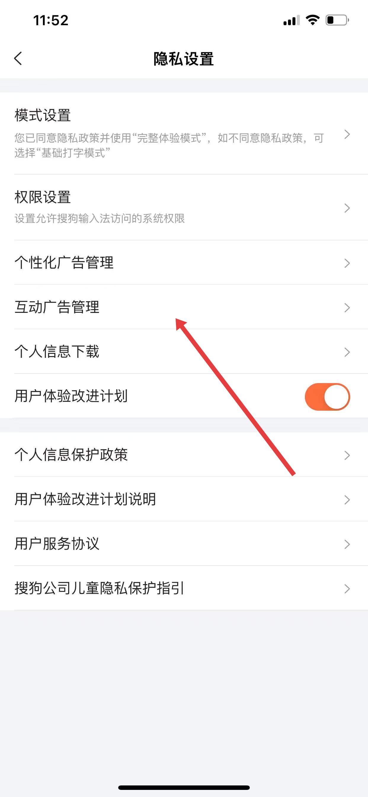 2、进入隐私设置界面后,点击互动广告管理。