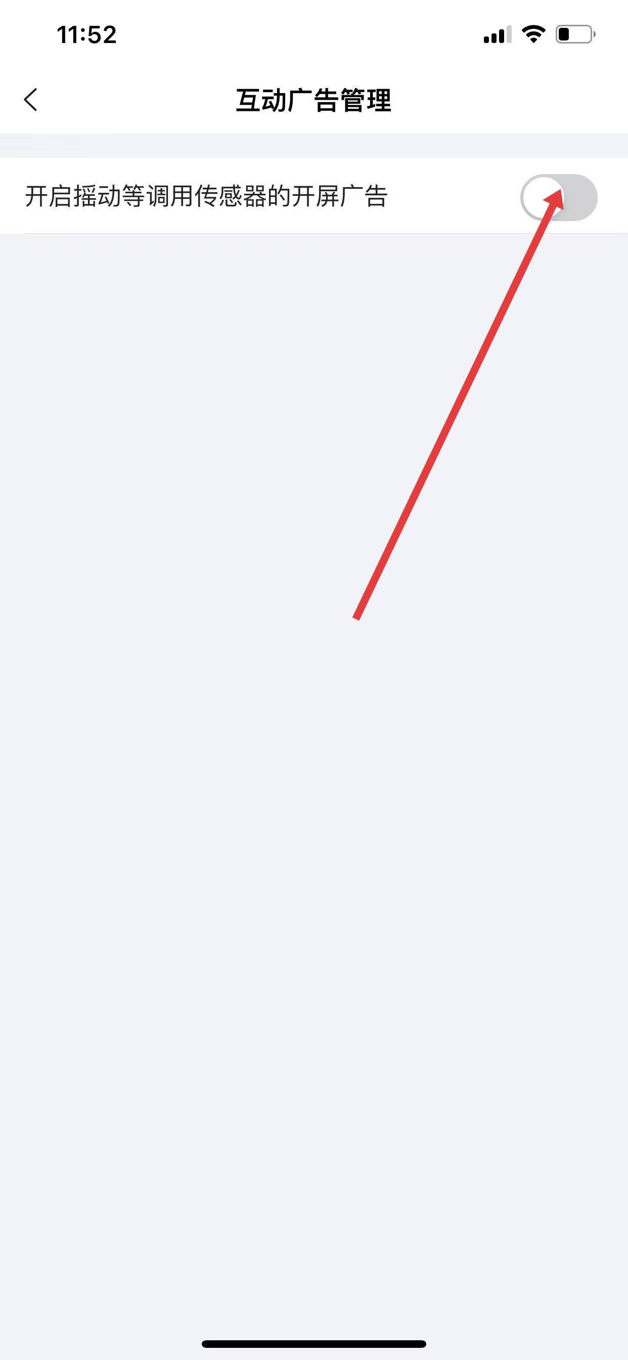 3、在互动广告管理页面,关闭开启摇动等调用传感器的开屏广告开关。