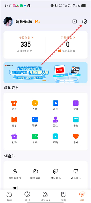 1)首先,我们打开搜狗输入法软件点击右上角的【人形】进入到我的页面,接着再找到【设置】点击进去。