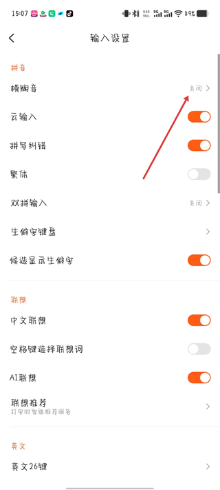 3、在输入设置页面,点击模糊音选项。