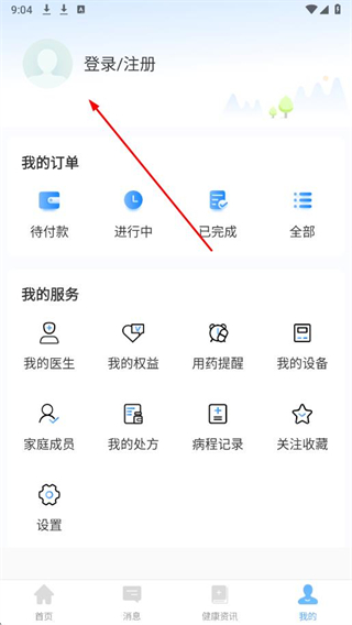 2、在我的页面点击登录/注册区域,进入登录页面。