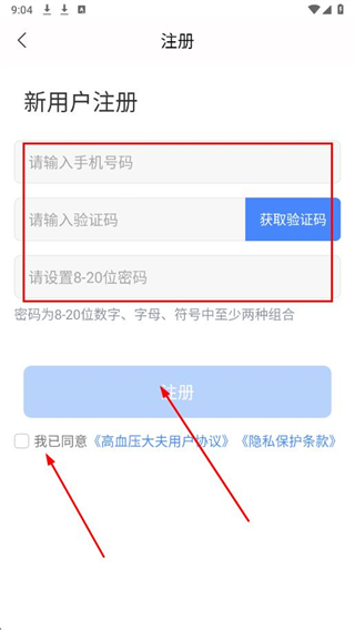 4、输入手机号码,填入验证码,设置密码,勾选协议后,点击注册。