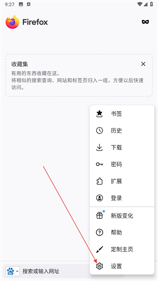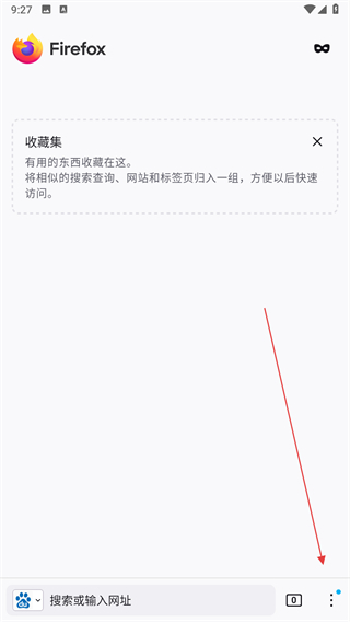 1、打开火狐浏览器进入主界面,点击底部搜索框右侧的三点图标。