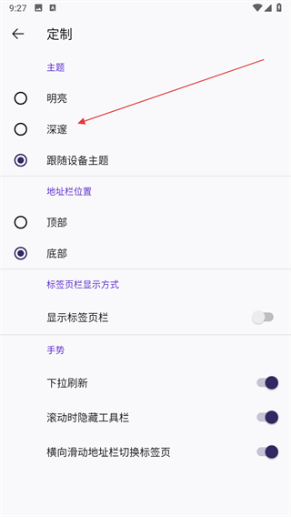 4、在定制页面的主题分类下,找到深邃选项并点击选中该主题。