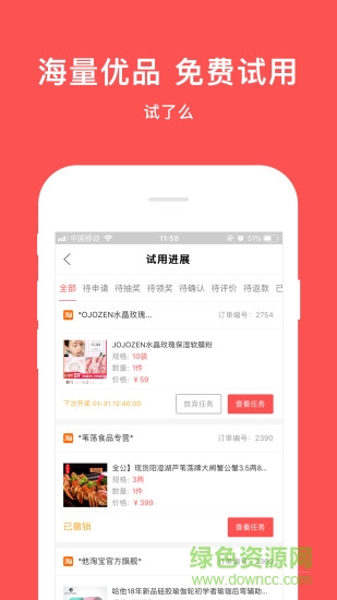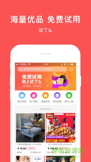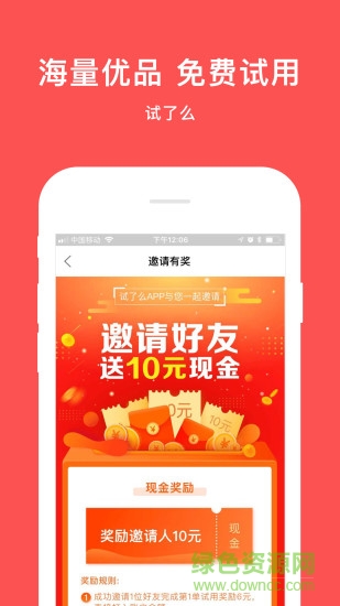 试了么app是一款产品试用平台,这里提供了海量热销产品,覆盖了零食、服饰、家电、日用品等,用户申请试用通过率高,试用完无需返还,邀请好友还可以获取佣金,欢迎来绿色资源网下载!