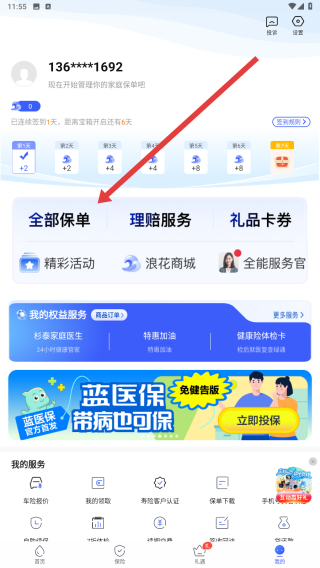2、在我的主页中,可以通过点击全部保单,查询我的保单详情。