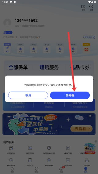 3、点击弹窗中的去完善按钮,填写身份证等信息完善身份后,查询我的保单信息。