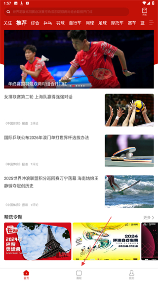1、在中国体育主界面底部,点击赛程选项,进入赛事赛程列表页面。